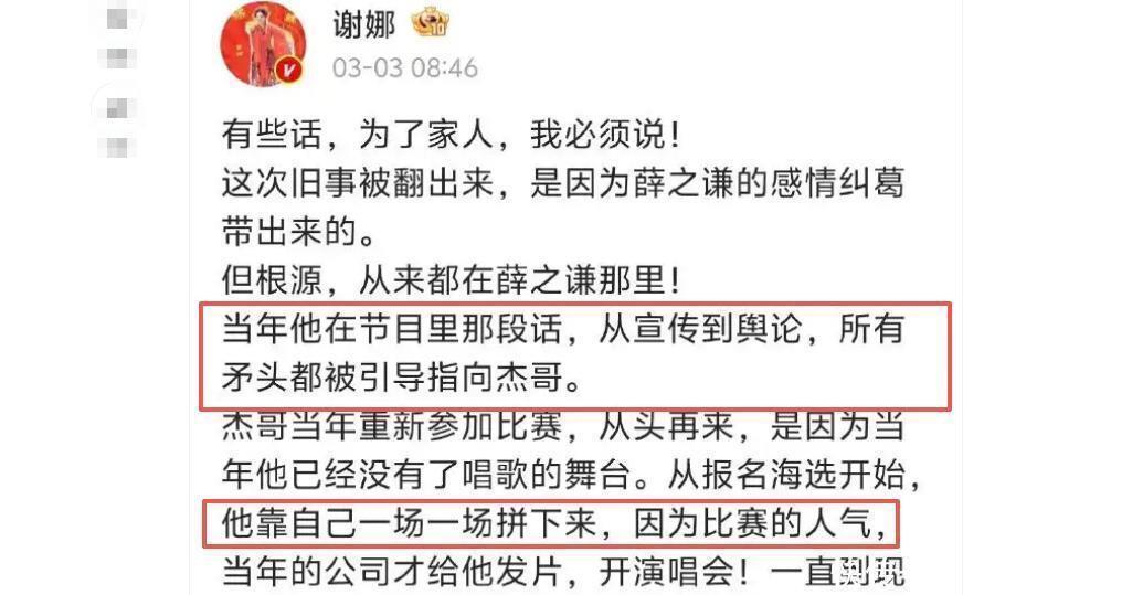 时间来到2026年3月,薛之谦的前女友李雨桐实名举报薛之谦,并在爆料中顺带提了一句,说薛之谦私下吐槽“张杰唱歌土”。 这句话像一根导火索,瞬间点燃了埋藏多年的旧怨。 网友们立刻翻出了2017年薛之谦在《吐槽大会》上的那段发言:“我一没提前解约,二不偷不抢,三没找有钱女友发片,四没找比我红的女友辅佐我。 红,要红得有尊严。 ”尽管节目规则是吐槽在场嘉宾,而张杰当时并不在场,这段话因为与张杰的经历高度重合,提前解约、与当时已是顶流主持人的谢娜相恋,被无数人自动对号入座,认为是影射张杰。 九年来,“靠老婆”的标签成了张杰挥之不去的阴影。这一次,谢娜没有选择沉默。 3月3日早上,她发布了那篇引爆网络的长文。 文章里没有嘻嘻哈哈,没有插科打诨,措辞清晰,逻辑完整。 她指出,这次旧事被翻出来是因为薛之谦的感情纠葛,根源从来都在薛之谦那里。 她细数张杰如何从海选开始,一场一场靠自己拼出来,却因为一段被舆论引导的言论,承受了多年的无妄之灾。 她直接喊话:“薛之谦,当年那段话是你说的,你可以说你说的不是他,而舆论引导是因为你而造成的,伤害已经造成……你缩在段子手后面,吃着红利,伤害着无辜! 而你,这些年一句道歉的话都没有! ”她最后只要求一件事:请薛之谦正视自己的言行,为被无端牵扯的张杰,正式道歉。